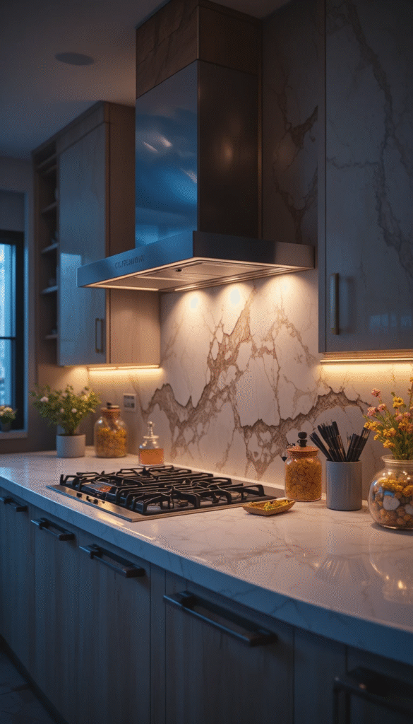 Integrated LED lighting under the hood cover improves both functionality and ambiance. Warm white lighting enhances cooking visibility while maintaining a cozy atmosphere. Concealed light strips inside trim edges create a soft glow at night. Smart lighting options allow you to control brightness with your phone or voice assistant.
