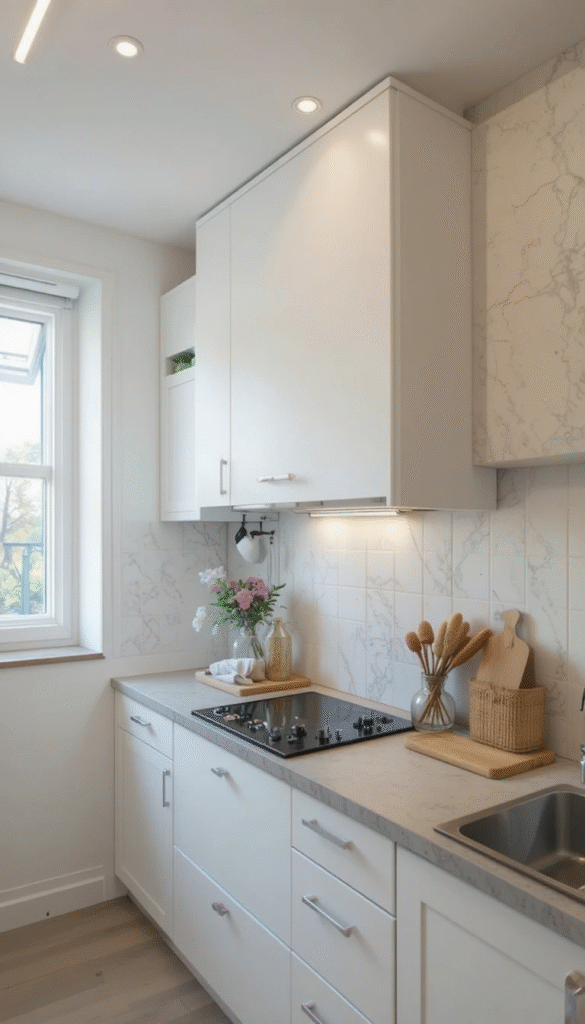 In compact kitchens, choose slim and simple designs to avoid overwhelming the space. Light colors make ceilings feel higher and rooms appear larger. Tapered shapes can create an illusion of vertical space. Keeping decorative elements minimal maintains visual balance.