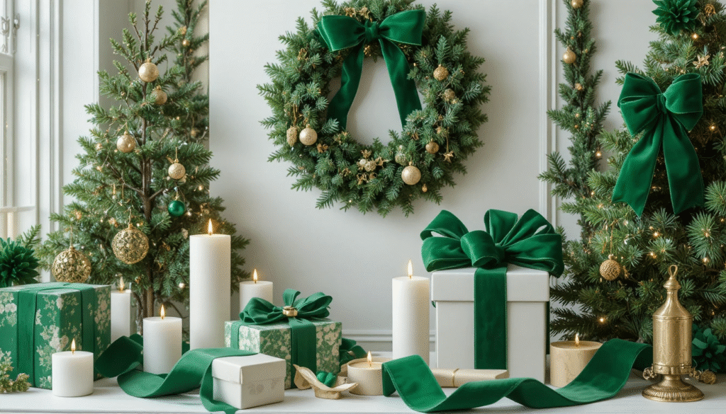 Green velvet ribbons instantly add a luxurious and soft texture to your holiday décor. You can tie them around wreaths, tree branches, gift boxes, or even candle holders. The deep green shade looks especially stunning against white surfaces, creating a polished and high-end Christmas feel.