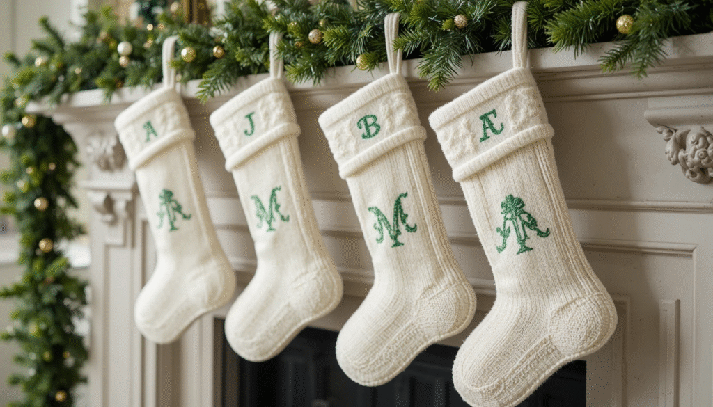 White knit stockings with subtle green embroidery or monograms feel both charming and personalized. They look clean, minimal, and beautifully seasonal when hung on a fireplace mantel. The soft patterns help keep the space festive while maintaining the calmness of your green-and-white theme.