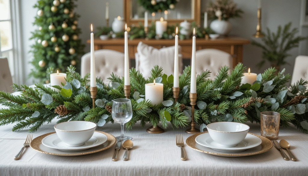 A centerpiece made of pine branches, eucalyptus, or fir instantly brings natural elegance to your dining table. Pair it with white candles, ceramic dishes, and soft linens for a classic, peaceful Christmas table. The mix of greenery and white accents creates a balanced and inviting setting for holiday dinners.