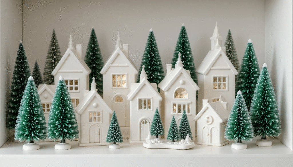 Mini ceramic houses paired with little green Christmas trees create an adorable holiday village scene. These decorations look beautiful on shelves, console tables, or window sills. Their neutral color palette blends well with other décor pieces while still making a charming, storybook-style addition to your home.