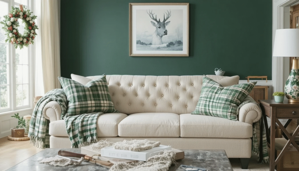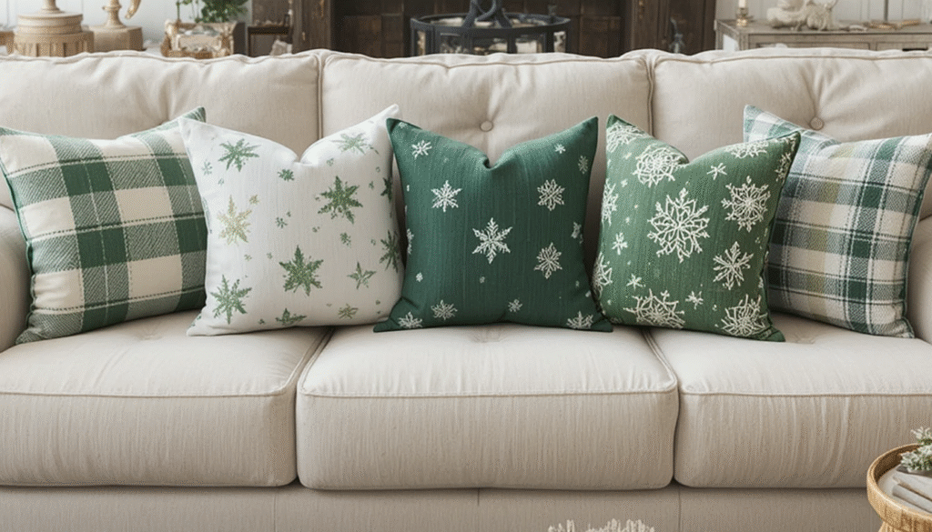 Switching out your regular throw pillows for green and white versions is one of the easiest ways to update your living room for Christmas. Look for patterns like plaid, snowflakes, or simple stripes. These small details help your space feel festive, warm, and perfectly coordinated with your overall décor theme.