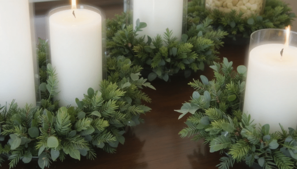 White pillar candles surrounded by small wreath rings made of pine or eucalyptus create an elegant tabletop accent. This décor idea is great for coffee tables, countertops, or entryway consoles. The candlelight adds soft warmth while the greenery gives a natural, holiday-inspired touch.