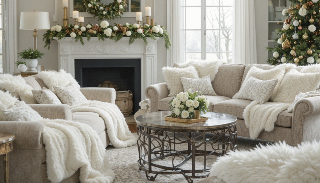 White faux-fur blankets draped over sofas, chairs, or beds add a cozy winter texture that complements your green elements. The soft white look resembles snow and enhances the warm, inviting ambiance of your holiday décor. This idea is perfect for creating comfortable spaces where family and guests feel relaxed.