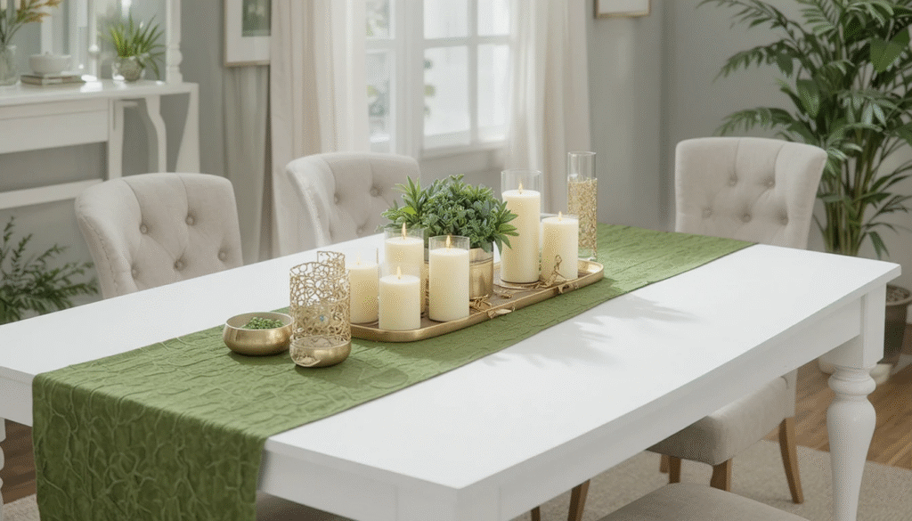 A green linen or velvet table runner adds a beautiful contrast when placed on a white dining table or coffee table. It helps define the table and creates an elegant base for candles, centerpieces, or serving trays. The mix of green and white keeps the styling calm but visually appealing.