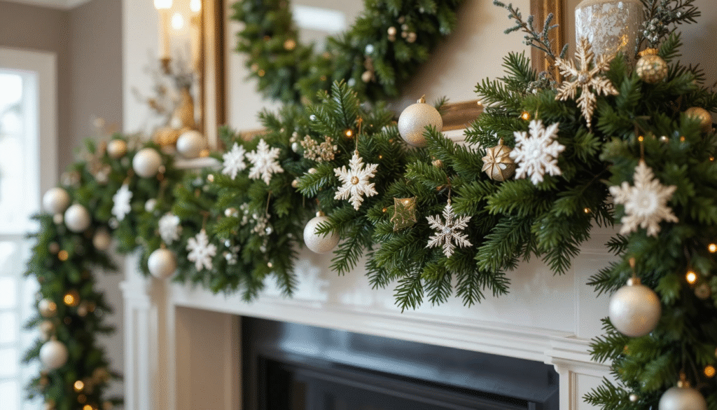 Green garlands draped along doorways or mantels look extra festive when decorated with white snowflake ornaments. This design creates a delicate winter effect without going over the top. The snowflakes add charm and seasonal flair while keeping your color theme consistent.