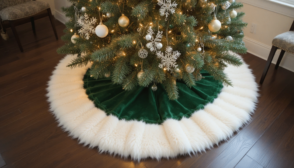 Layering a green velvet tree skirt over a white faux-fur skirt adds dimension and richness under your Christmas tree. This combination looks warm, cohesive, and luxurious. It also helps ground the tree décor and ties together both colors elegantly.