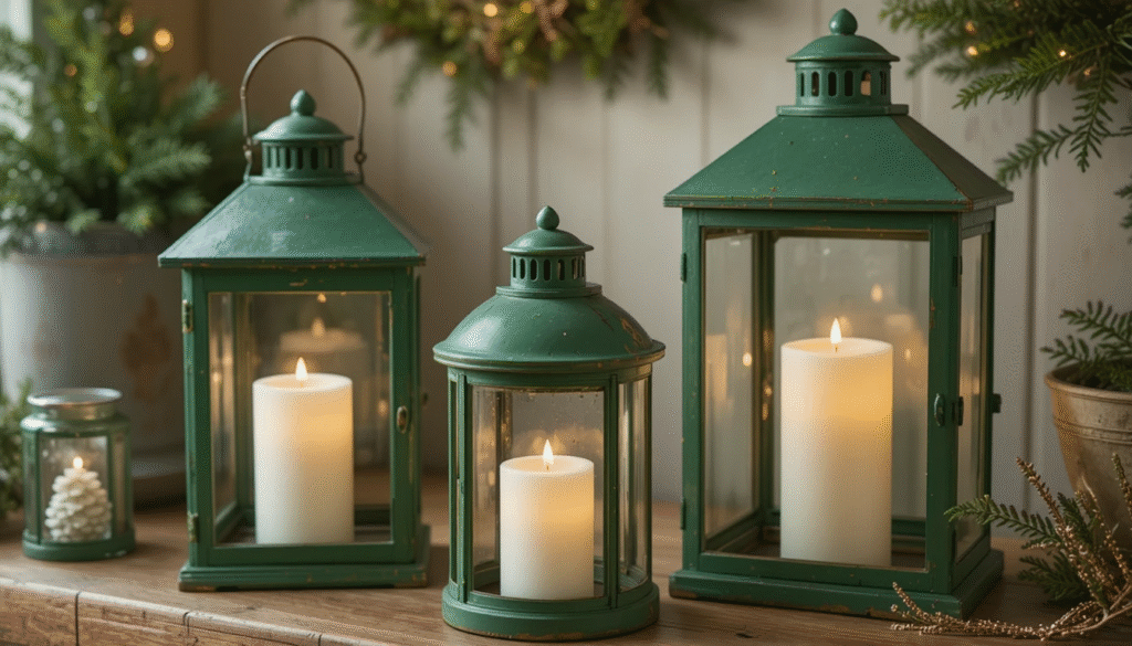 Green metal or wooden lanterns filled with white LED candles bring a cozy farmhouse-style charm to your holiday décor. They look beautiful on porches, entryways, or near the fireplace. The soft glow adds warmth, while the green exterior maintains the overall theme.