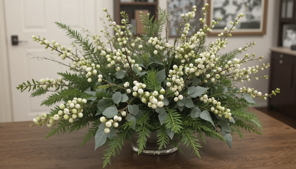Green floral arrangements made of eucalyptus, pine, and ferns become instantly festive when you add white berry sprays. The berries brighten the arrangement and highlight the natural shapes of the branches. This combination looks great on side tables, nightstands, or bathroom counters.