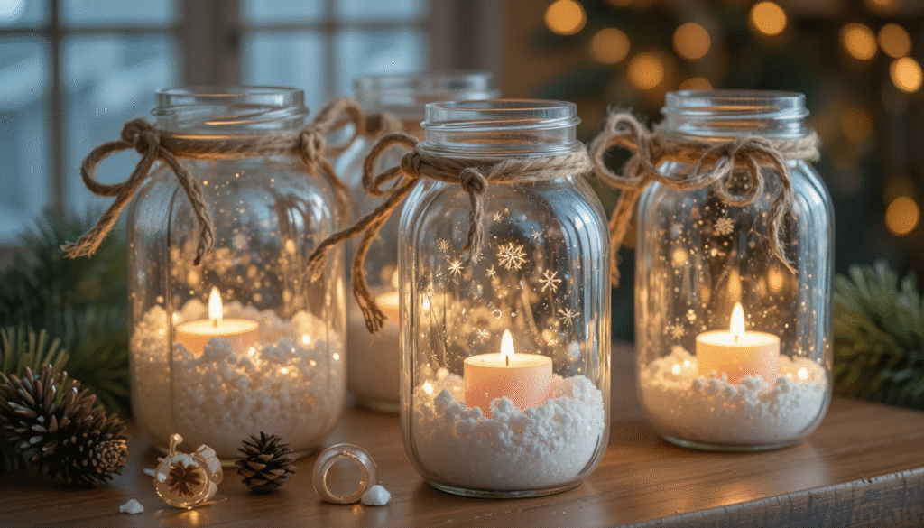 Mason jars are an American classic, and they make stunning Christmas lanterns. Simply fill them with faux snow, insert a LED tealight candle, and decorate the jar with twine, ribbon, or small pinecones. These lanterns glow beautifully on tabletops or windowsills and instantly create a cozy, warm holiday atmosphere. Their charm and simplicity make them perfect handmade gifts as well.