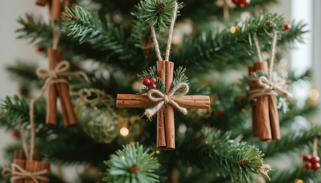 Cinnamon stick ornaments add both beauty and a warm holiday scent to your tree. Tie three cinnamon sticks together using jute string and decorate with small berries, tiny bows, or greenery. These rustic ornaments blend well with farmhouse or natural-style Christmas décor and stay fragrant for weeks. They’re easy enough for kids to help make and also inexpensive for large batches.