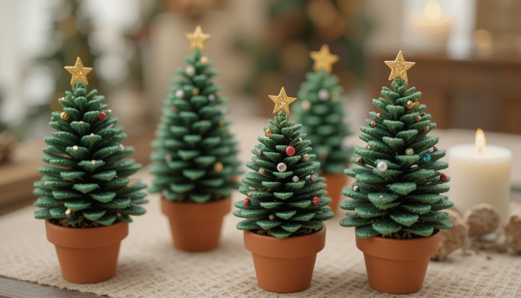 Mini pinecone trees are perfect for tabletops, shelves, and window displays. Paint pinecones green, add small beads or gems as ornaments, and glue a tiny star on top. You can place them in small terracotta pots or wooden stands to create a delightful holiday forest look. These charming trees bring nature indoors and complement rustic or woodland-inspired décor beautifully.