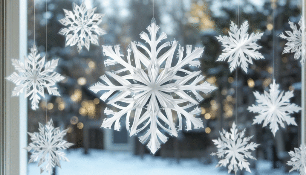 Paper snowflakes offer a simple yet elegant handmade décor option. Fold white craft paper, cut intricate patterns, and unfold to reveal unique designs. Hang them in windows with clear string or tape them on walls to create a winter wonderland effect. This craft is budget-friendly, kid-friendly, and ideal for creating a light, airy Christmas theme in any room.