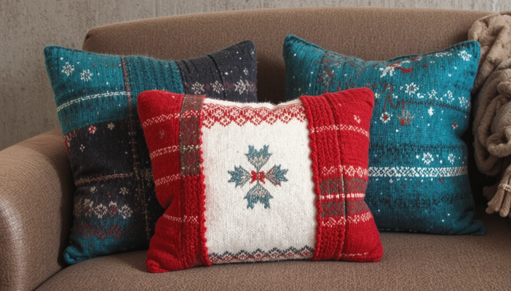 Transform old sweaters into cozy holiday pillow covers. Cut panels from the sweater, sew the edges, and add buttons or zippers for closure. These handmade pillows add warmth, texture, and a festive winter vibe to living rooms or bedrooms. It’s a great way to recycle old clothing and create unique seasonal home décor.