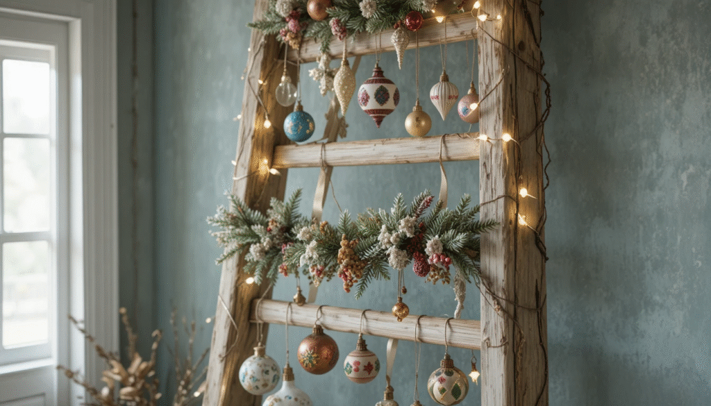 A rustic wooden ladder makes a beautiful handmade ornament display. Sand and paint the ladder, then hang ornaments, garlands, or fairy lights from each rung. This creates a charming alternative to traditional décor and adds height and interest to living spaces. It’s especially great for showcasing sentimental handmade ornaments.