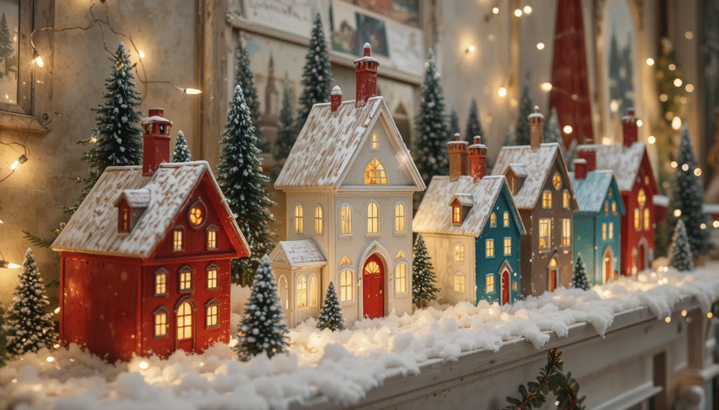 Create your own miniature Christmas village by painting small wooden or ceramic houses. Use white paint for a snowy look or bright colors for a cheerful town theme. Arrange the houses on mantels, tables, or shelves with faux snow to create a magical holiday display. This DIY project offers endless creativity and looks stunning glowing under soft string lights.