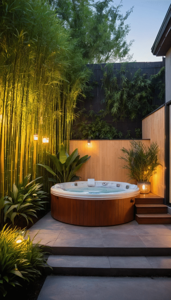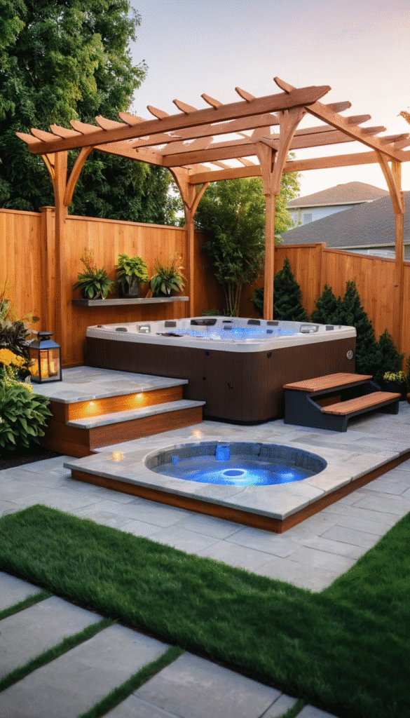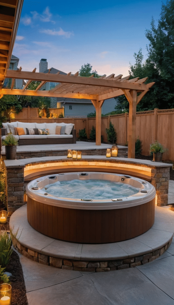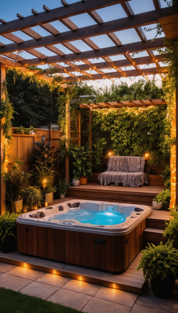 Adding a pergola over your Jacuzzi offers shade and style. It provides partial protection from sun and rain. String lights or hanging plants can be added for decoration. Pergolas enhance privacy while elevating overall backyard aesthetics.