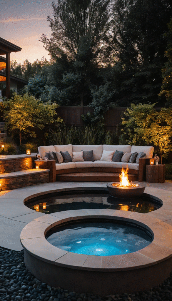 Creating a lounge space around your Jacuzzi improves social interaction. Built-in benches, fire pits, and outdoor sofas transform the area into a gathering spot. This setup works well for hosting friends and family. It turns your spa zone into a complete entertainment space.