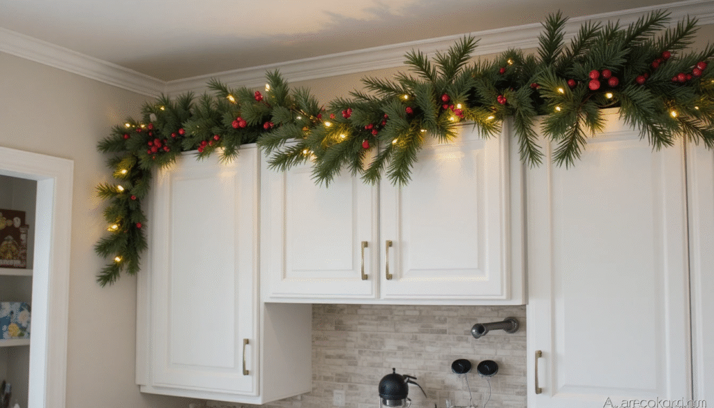 Decorate the space above your kitchen cabinets with a lush Christmas garland. Use one with pine, berries, and fairy lights for a warm and festive glow. It’s an effortless way to add height and charm without cluttering countertops.