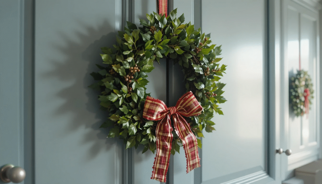 Small wreaths on your cabinet doors instantly create a classic holiday look. Choose mini green wreaths tied with red or plaid ribbons for a timeless touch. You can attach them using removable hooks to avoid any cabinet damage.