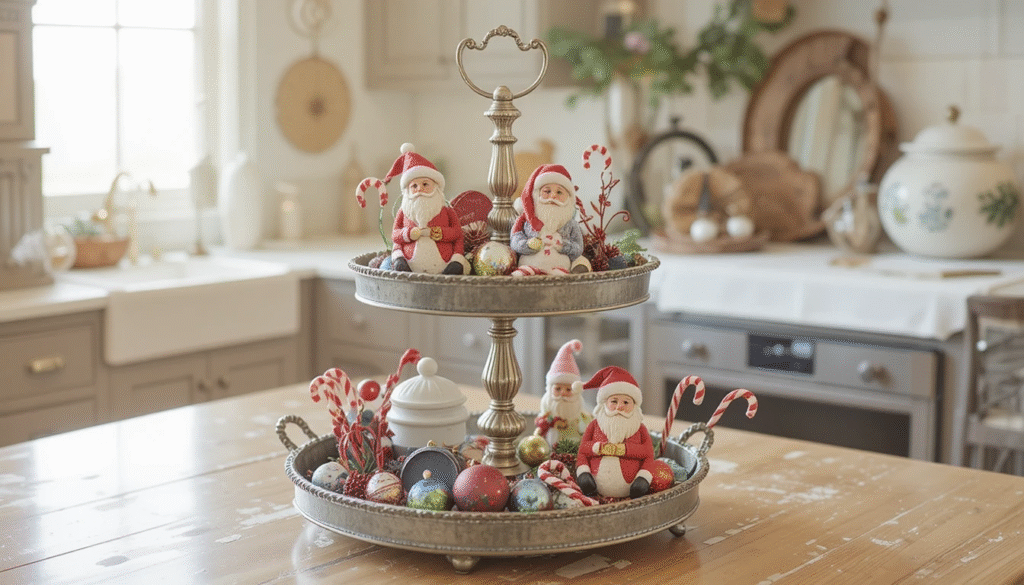 A tiered tray is perfect for small kitchens—it adds Christmas cheer without taking up too much space. Decorate it with mini ornaments, Santa figurines, candy canes, and a small “Merry Christmas” sign.