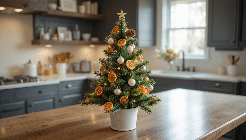 A mini Christmas tree on your countertop or kitchen island adds instant festive flair. Decorate it with mini ornaments, dried orange slices, or fairy lights for a charming farmhouse touch.