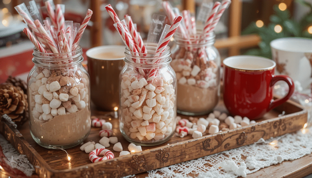 Create a cozy hot cocoa bar with festive jars filled with marshmallows, cocoa powder, and peppermint sticks. Use holiday trays, mugs, and small twinkle lights to complete the setup.