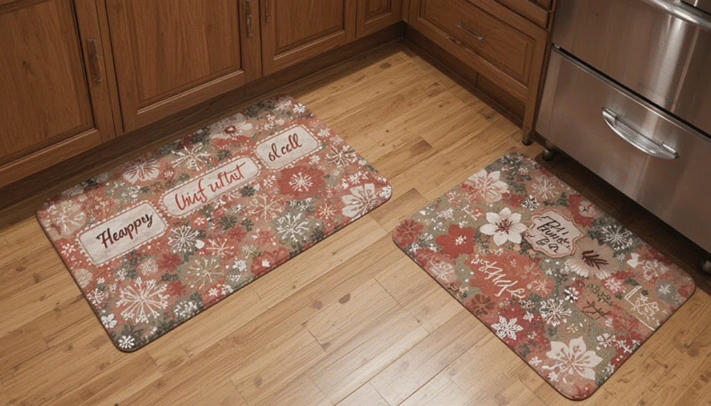 Replace your regular mats with Christmas-themed floor mats featuring festive quotes or snowflake patterns. They not only add style but also make cooking more comfortable during long holiday meals.