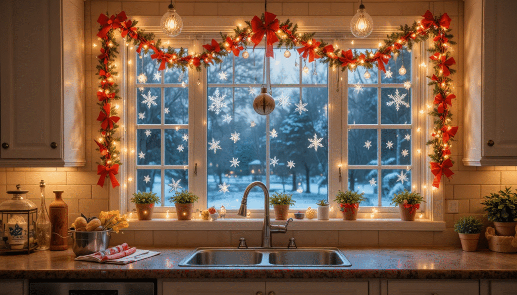 Add red ribbons, garlands, or string lights around your kitchen windows. You can also hang ornaments or snowflakes for a sparkling effect that shines day and night.