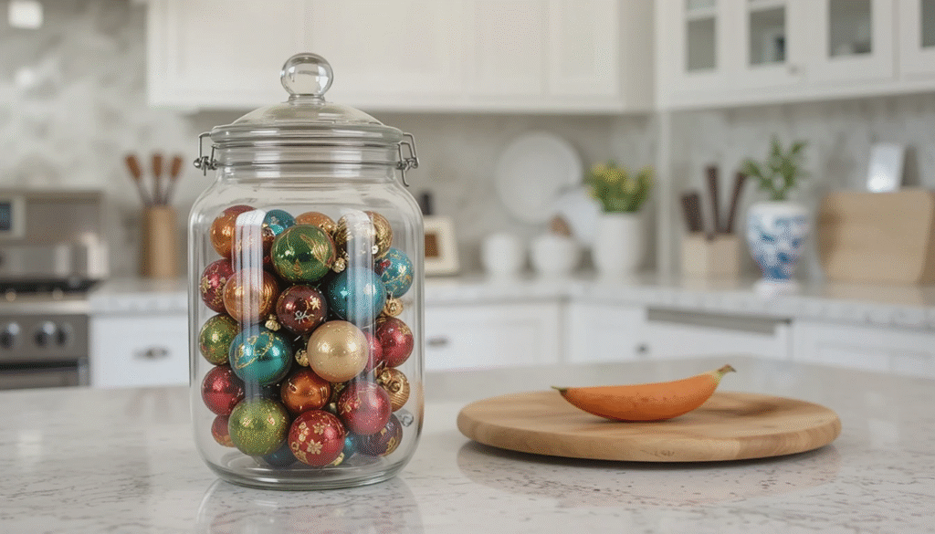 Fill a clear glass jar or bowl with colorful Christmas ornaments and place it on your kitchen island or countertop. It’s a simple, elegant way to bring holiday charm into your cooking space.