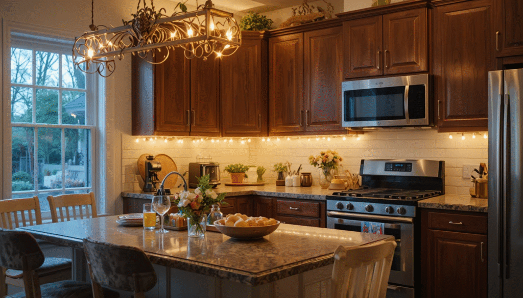 Install warm white string lights under your cabinets for a soft, glowing ambiance. They’ll make your kitchen sparkle and add a magical feeling during evening gatherings.