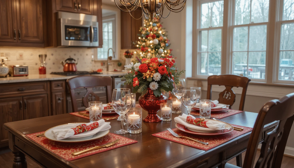 If you have a dining area in your kitchen, use Christmas-themed plates, napkins, and placemats. Think red, gold, or snowy white tones to make every meal feel like a holiday feast.