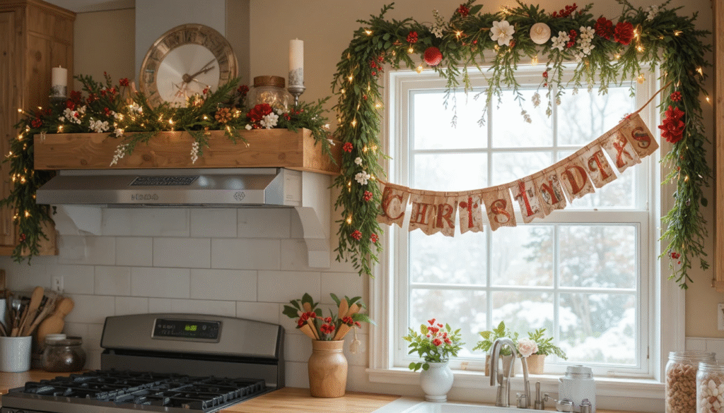 Add a touch of whimsy with a “Merry Christmas” banner or wooden sign above your stove or window. It’s a great way to highlight your kitchen’s festive personality.