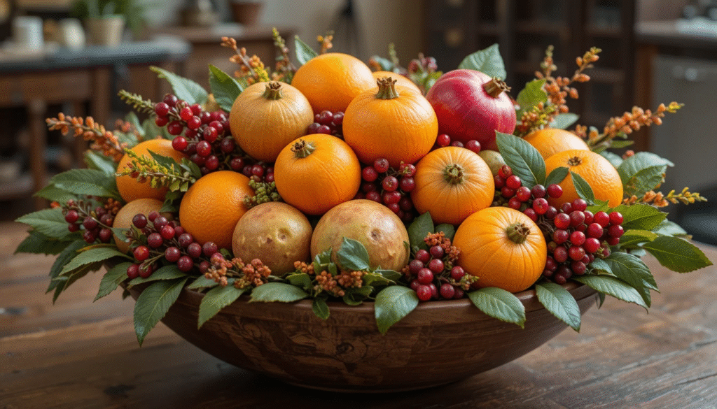 Use natural decor by arranging seasonal fruits like oranges, cranberries, and pomegranates in a large wooden bowl. It adds color, fragrance, and freshness to your space.