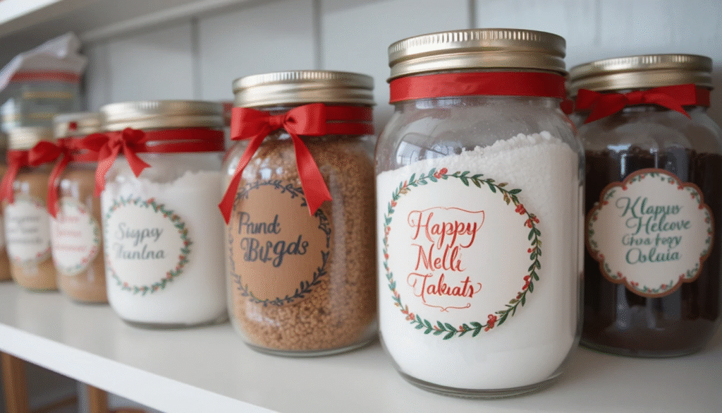 Swap your regular pantry jars for ones with holiday labels or red ribbons. Even your sugar, cocoa, and coffee jars can join in the Christmas fun!
