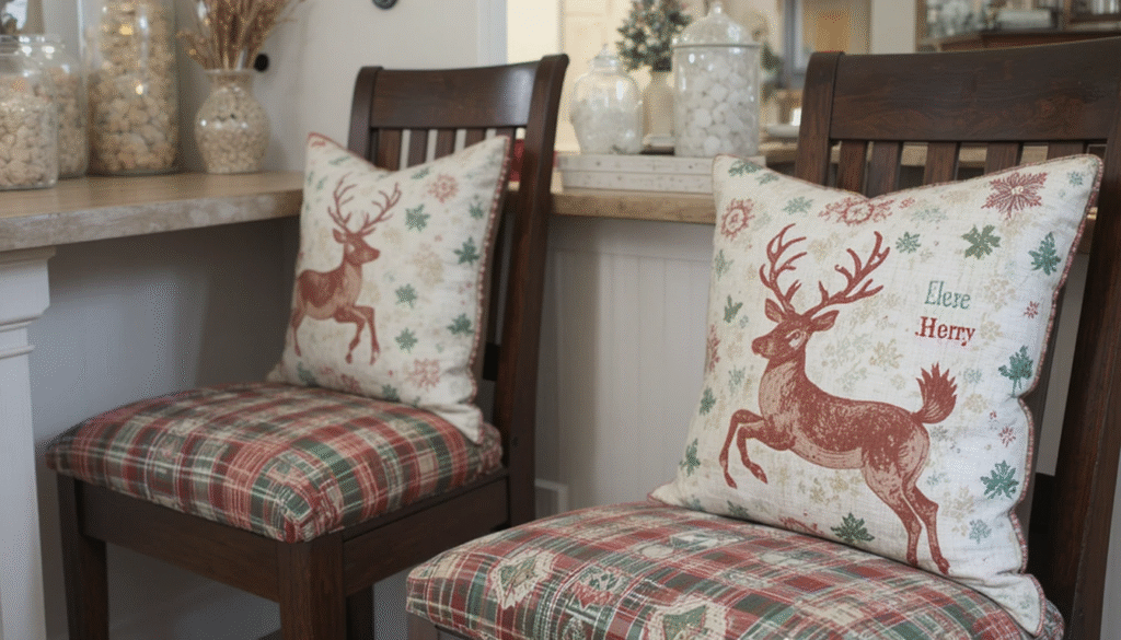 If you have bar stools or a breakfast nook, add Christmas-themed cushions or pillow covers. Patterns like plaid, snowflakes, or reindeer instantly cozy up the space.