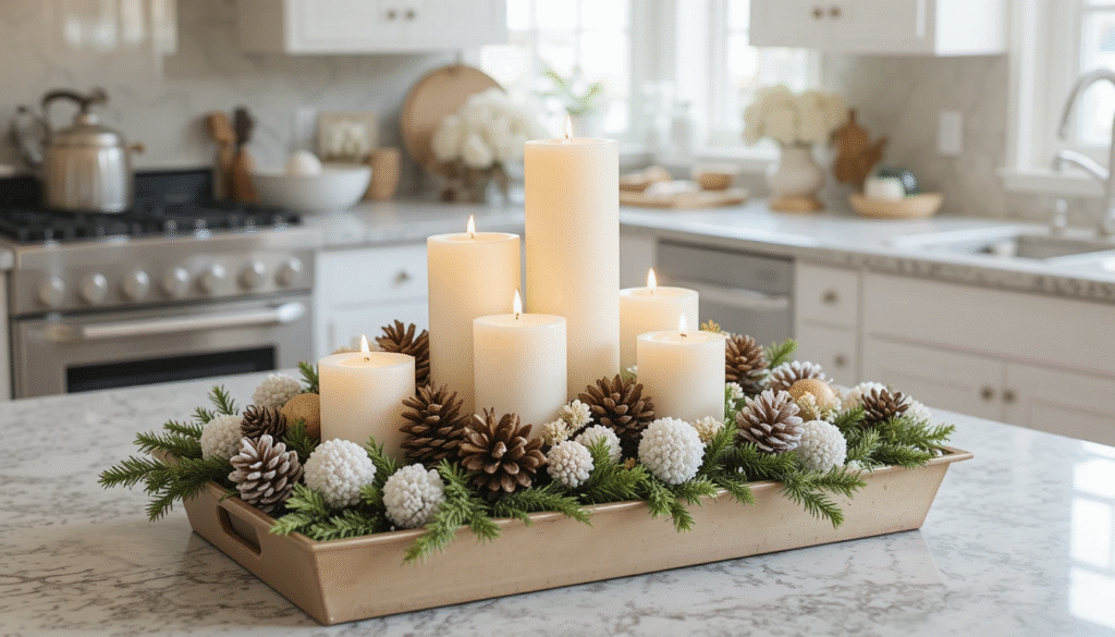 Transform your kitchen island into a festive focal point. Use a tray filled with candles, pinecones, and faux snow for a chic, seasonal centerpiece that’s easy to move when cooking.