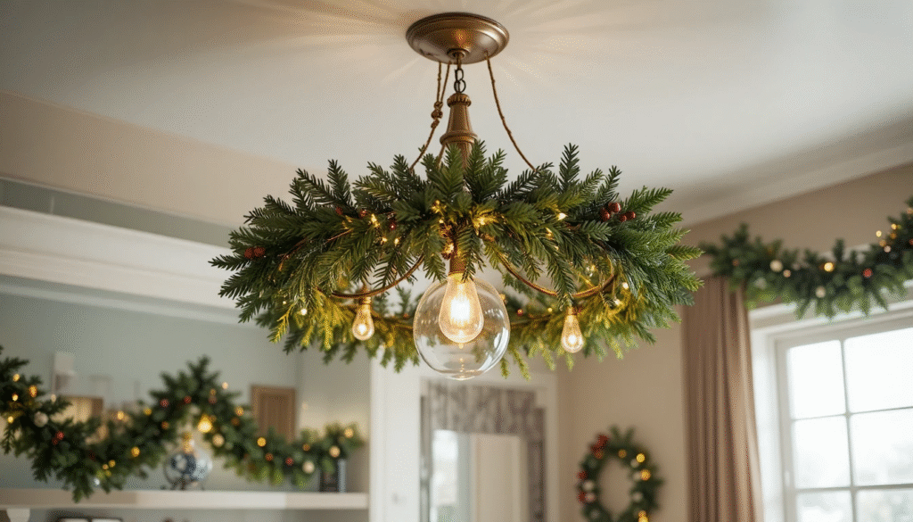 Wrap green garlands or ribbons around your pendant lights or chandeliers. It’s a creative way to extend your Christmas decor upward and create a cohesive festive look.