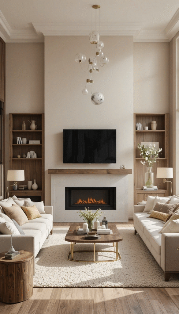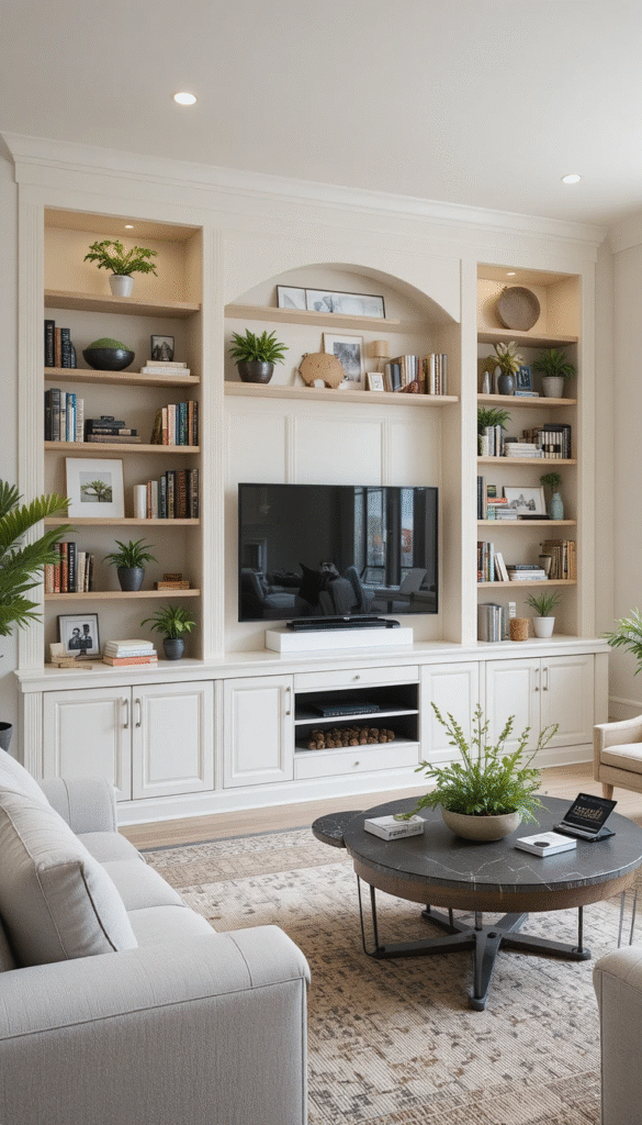 Functional wall design is a big deal in 2026. Built-in shelves around TVs or fireplaces offer both storage and display space. Styled with books, plants, and décor, these walls look custom-made and help keep living rooms organized and visually balanced.