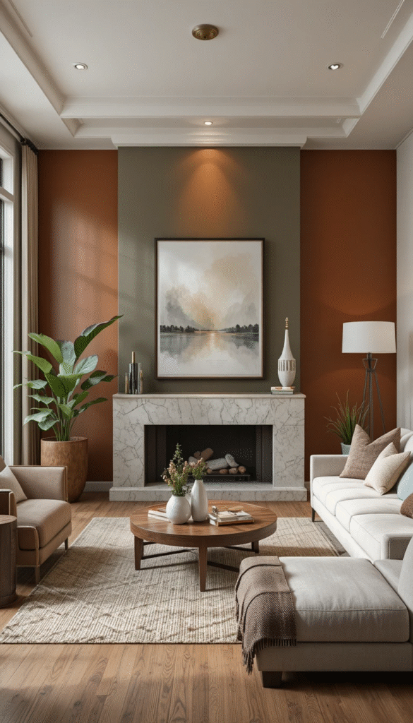 Accent walls are evolving with rich, earthy colors like clay, terracotta, olive green, and deep caramel. These shades bring a grounded, natural feel to the living room while still making a bold statement. Used on a single wall, they add personality without overpowering the entire space.