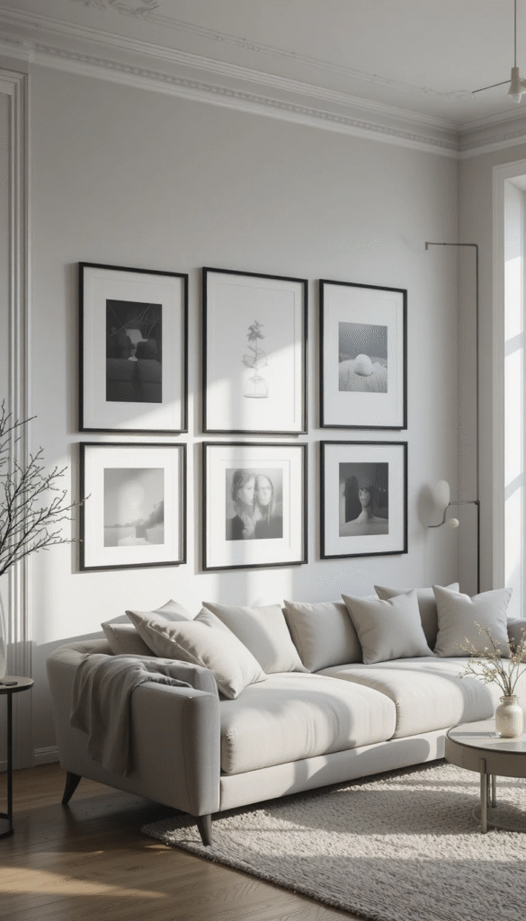 Gallery walls are still popular, but the 2026 version is more refined. Think fewer frames, consistent colors, and simple layouts. Black, white, or natural wood frames keep the look cohesive, allowing personal photos or art prints to shine without visual clutter.