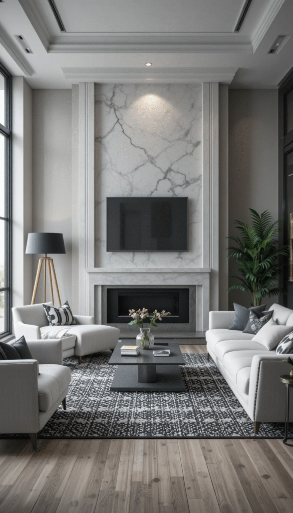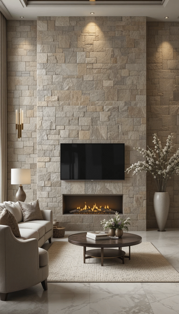 Natural stone or stone-look panels are gaining popularity for living room walls. Materials like limestone, travertine, or faux stone panels add a luxurious and earthy vibe. These designs are perfect for creating a high-end look without completely remodeling the space.