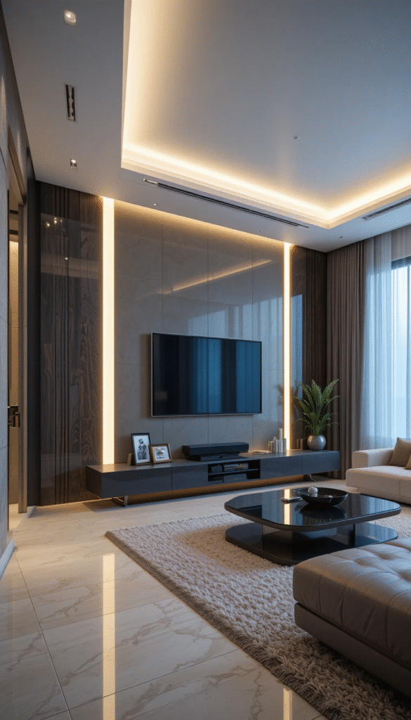Technology meets design with walls that include built-in LED lighting. Hidden light strips behind panels, shelves, or trims add ambiance and highlight architectural details. These smart wall designs make living rooms feel futuristic yet cozy, especially in the evenings.