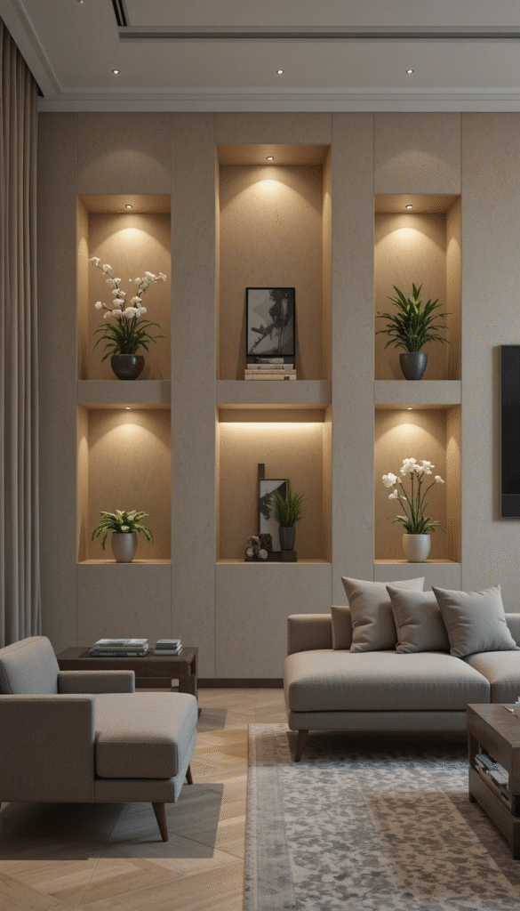 Built-in wall niches add depth and architectural detail without taking up floor space. In 2026, niches are styled with soft lighting, plants, or art pieces. They bring character to plain walls and work beautifully in both large and compact living rooms.