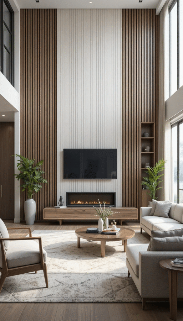 Wood wall panels are making a strong comeback, especially in vertical or slatted designs. Light oak, walnut, and natural finishes add warmth and texture while keeping the space modern. These walls work well in both urban apartments and suburban homes, offering a cozy yet upscale feel.