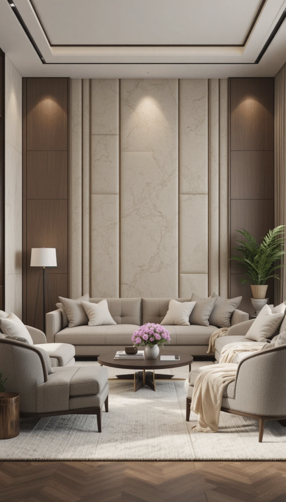 Vertical line patterns—painted, paneled, or textured—are used to visually raise ceiling height. This design is especially popular in homes with lower ceilings. In 2026, subtle vertical detailing adds elegance while making living rooms feel more spacious.