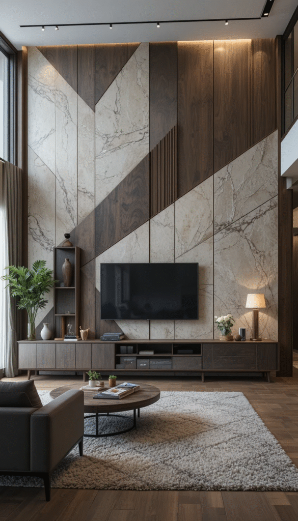 Perfect symmetry is giving way to creative asymmetry in wall design. Uneven paneling, off-center art placement, or mixed materials create a dynamic visual effect. This trend adds personality and a modern artistic touch to living room walls.