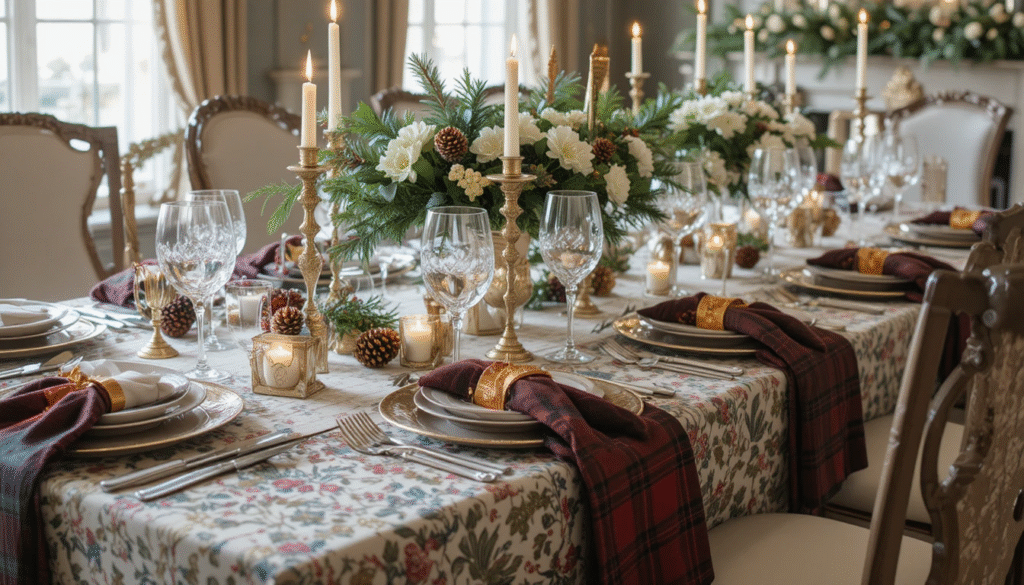 A Ralph Lauren-inspired Christmas table should feel both formal and inviting. Use fine china, crystal glassware, and polished silver cutlery to elevate the setting. Layer tartan or linen tablecloths with velvet napkin rings and gold-accented centerpieces. Add fresh greenery, pinecones, and candles for a natural touch that complements the luxurious theme without feeling overdone.