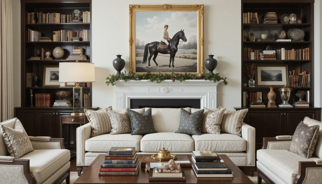 Ralph Lauren interiors are known for their curated elegance, and artwork plays a key role. Display equestrian prints, landscape paintings, or black-and-white photography in gold or wooden frames. Add stacks of vintage books on coffee tables or shelves to create that refined, intellectual charm. This combination of art and literature enhances the cultured, luxurious holiday atmosphere.